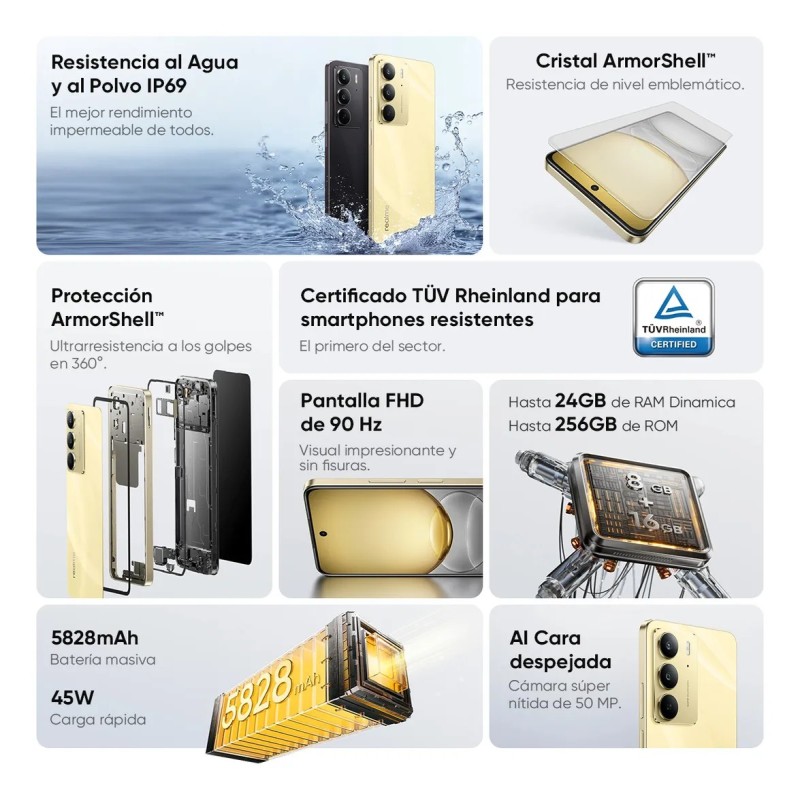 La vida está llena de sorpresas. El realme C75 está diseñado con materiales robustos y una estructura de absorción de impactos avanzada, por lo que está preparado para las caídas inesperadas de la vida. No importa a dónde te lleven tus aventuras, el realme C75 está diseñado para resistir.